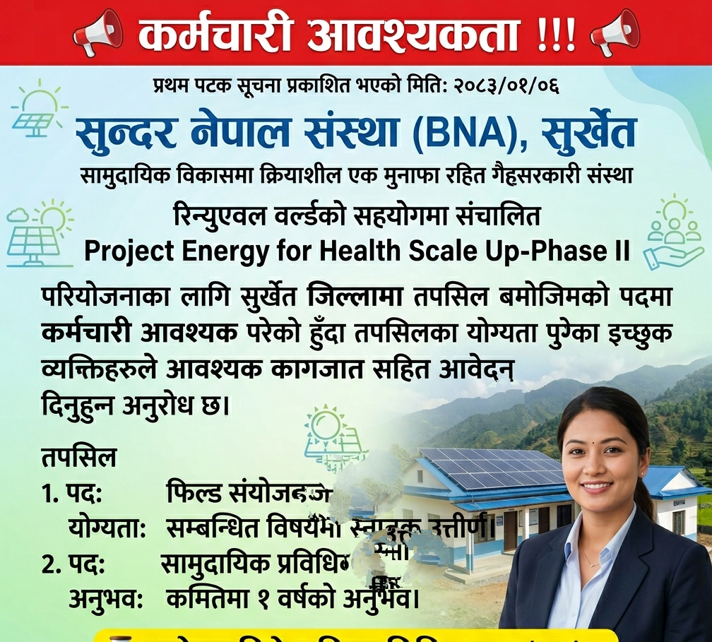 सुन्दर नेपाल संस्था (BNA), सुर्खेत सामुदायिक विकासमा क्रियाशील एक मुनाफा रहित गैह्रसरकारी संस्था हो । रिन्युएवल वर्ल्डको सहयोगमा सन्चालित Project Energy for Health Scale Up-Phase II परियोजनाका लागि सुर्खेत जिल्लामा तपसिल बमोजिमको पदमा कर्मचारी आवश्यक परेको हुँदा तपसिलका योग्यता पुगेका…