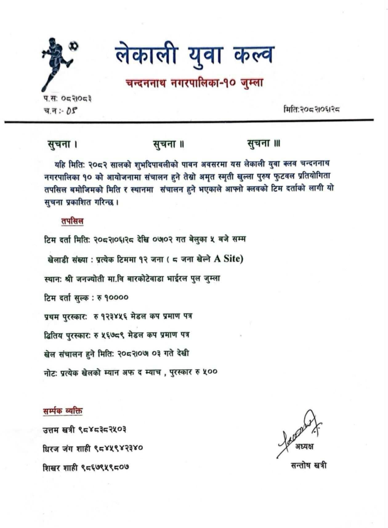 जिल्ला ट्राफिक प्रहरी कार्यालयका प्रमुख तथा प्रहरी सहायक निरीक्षक नन्दबहादुर विष्टका अनुसार कार्यक्रम युवा अधिकार तथा मानव रक्षक सञ्जाल जुम्लाको समन्वयमा जिल्ला प्रहरी कार्यालय जुम्लाले आयोजना गरेको हो।